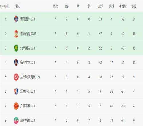 青岛海牛U21、青岛西海岸U21以7-0的同样比分,大胜广西平果U21、兰州陇原竞技U21,完美收官。其中,青岛海牛U21豪取7连胜,而且仅丢1球,最终积21分,位列L组榜首,总成绩第9。青岛西海岸U21紧随其后,积18分,排名总成绩第10。梅州客家U21积12分,总排名第12。兰州陇原竞技U21、江西庐山U21、广西平果U21、昆明城星U21,分列总成绩第13至16。其中,昆明城星U21遭遇7连败,而且仅进2球,狂丢73球,数据有些惨。